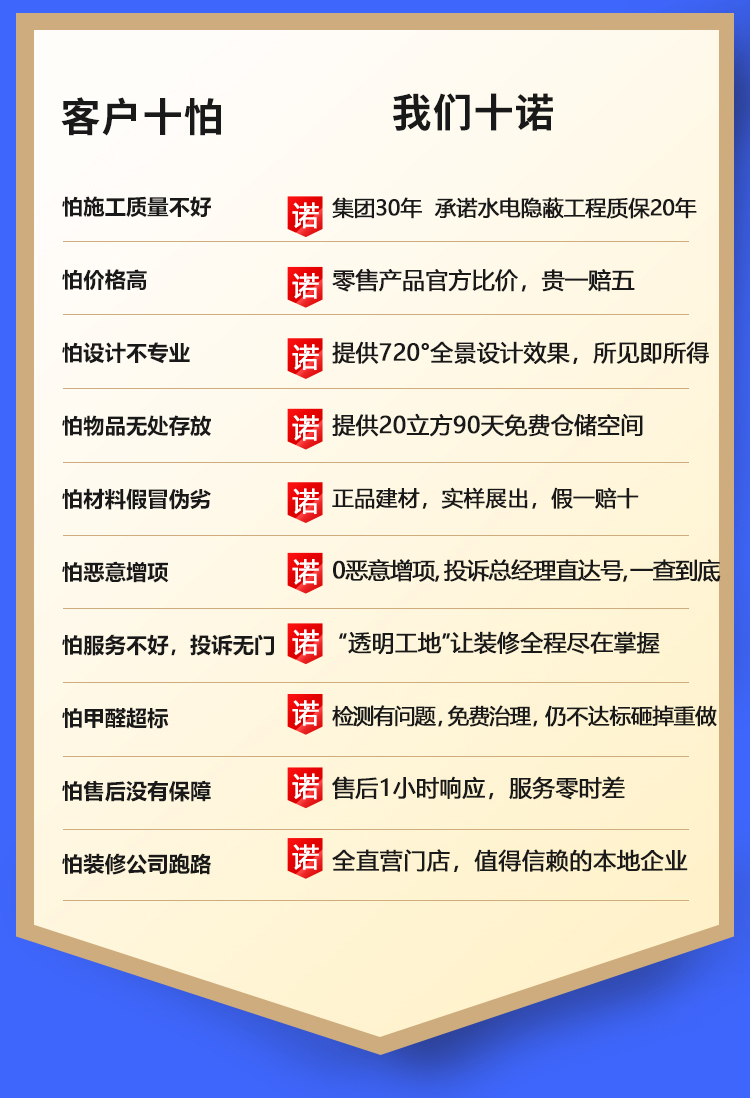 承诺水电隐蔽工程质保20年,卫生间防渗漏工程 质保10年,32项主控项不达标,砸掉重做;