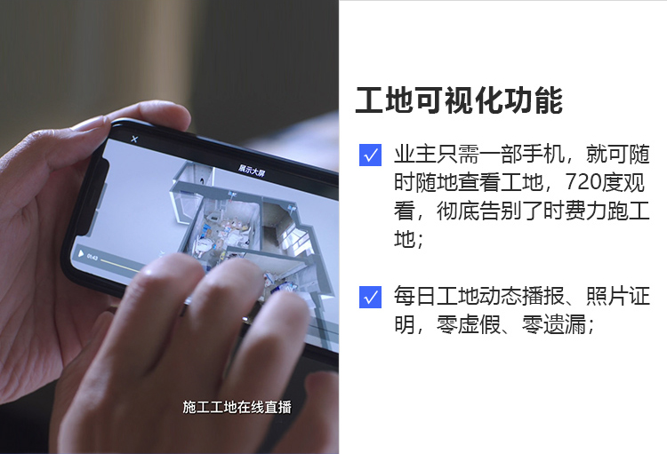 业主只需一部手机,就可随时随地查看工地,720度观看,彻底告别了时费力跑工地;